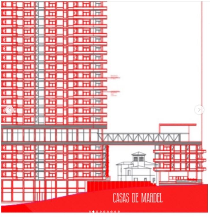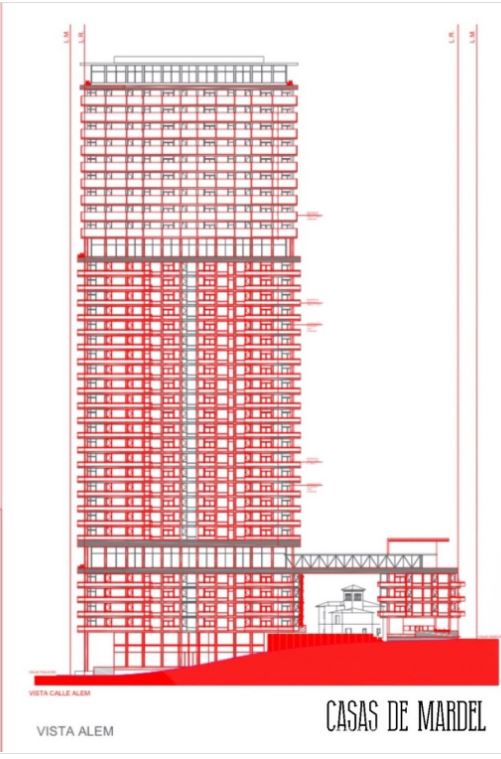 «Presentamos el edificio de 35 pisos (unos 125 metros), que quieren construir en una manzana donde el máximo permitido son 7 m. Al lado se construirá otro más bajo, y ambos estarán unidos por un puente. Desde Alem, por debajo del puente, se vería la residencia Frers de Mahn «La Robla», que se «pone en valor», aunque luce completamente empequeñecida, a través de lo que han denominado «ventana urbana».